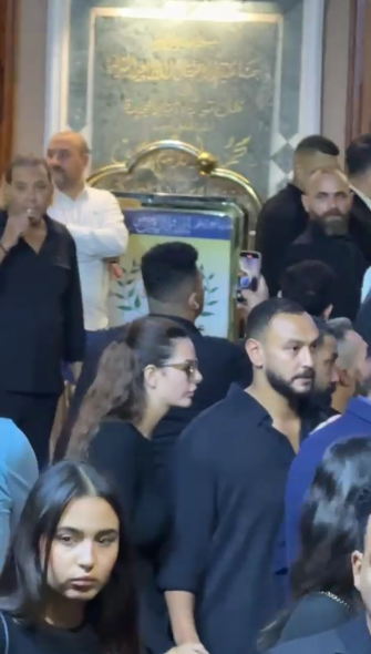 "ماسك إيديها"، هنادي مهنا برفقة زوجها في عزاء والد محمد رمضان