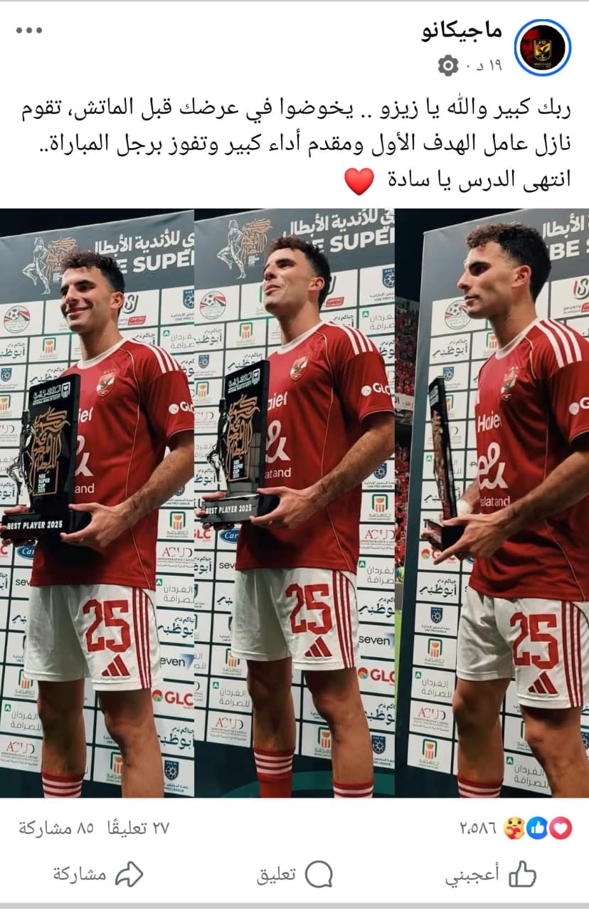 واحتفت الصفحة، بفوز زيزو بلقب رجل المباراة، خاصة مع تعرضه لهجوم ولسع من جمهور الأبيض، وكان رده هو إحراز الهدف الأول في شباكهم.