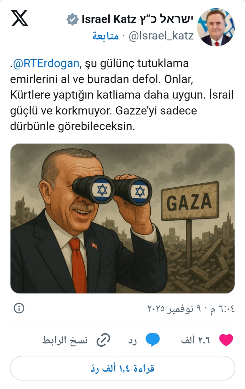 وفي رد من تل أبيب، هاجم وزير الدفاع الإسرائيلي يسرائيل كاتس، الرئيس التركي رجب طيب أردوغان، بشدة، وكتب في منشورين عبر منصة "إكس" باللغتين العبرية والتركية: "أردوغان، خذ أوامر الاعتقال السخيفة خاصتك وانقلع، فهي أنسب للمجازر التي ارتكبتموها بحق الأكراد، إسرائيل قوية ولا تهاب شيئًا".