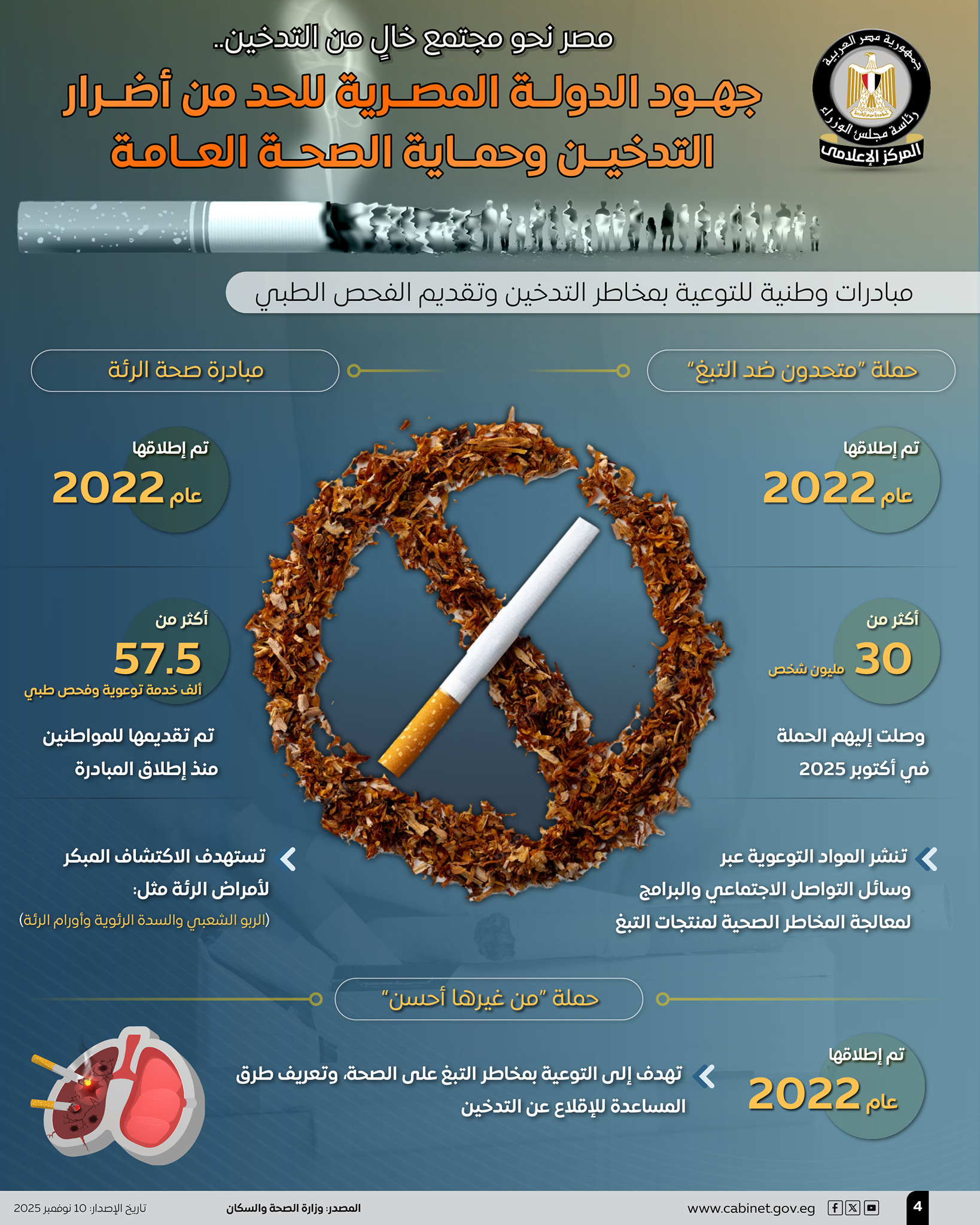 وعلى صعيد المبادرات الوطنية للتوعية بمخاطر التدخين وتقديم الفحص الطبي، أوضحت الإنفوجرافات، أنه تم إطلاق حملة "متحدون ضد التبغ" عام 2022، والتي وصلت إلى أكثر من 30 مليون شخص في أكتوبر 2025، بهدف نشر المواد التوعوية عبر وسائل التواصل الاجتماعي والبرامج لمعالجة المخاطر الصحية لمنتجات التبغ.