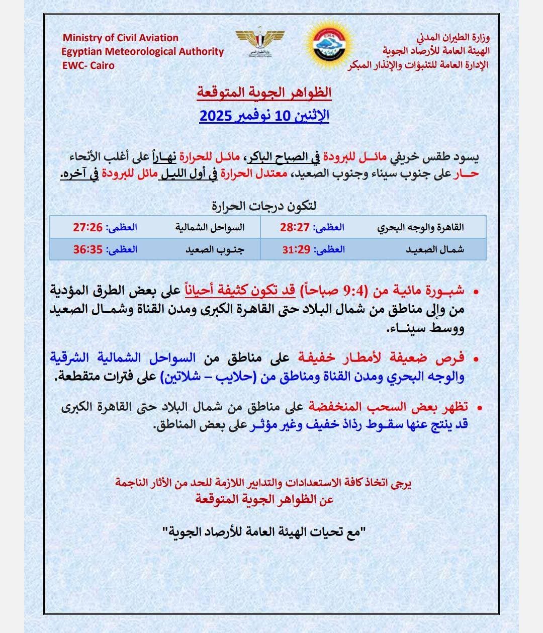 حالة الطقس العامة في مصر اليوم الإثنين 10 نوفمبر 2025