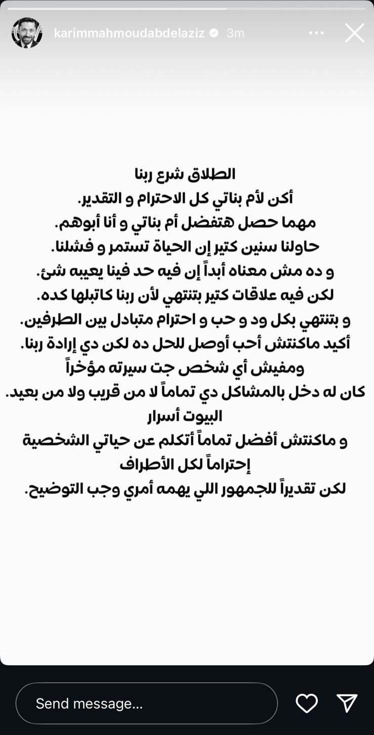 وكتب كريم محمود عبد العزيز عبر حسابه الرسمي على منصة “إنستجرام”: “الطلاق شرع ربنا.. أكن لأم بناتي كل الاحترام والتقدير مهما حصل هتفضل أم بناتي وأنا أبوهم”.
