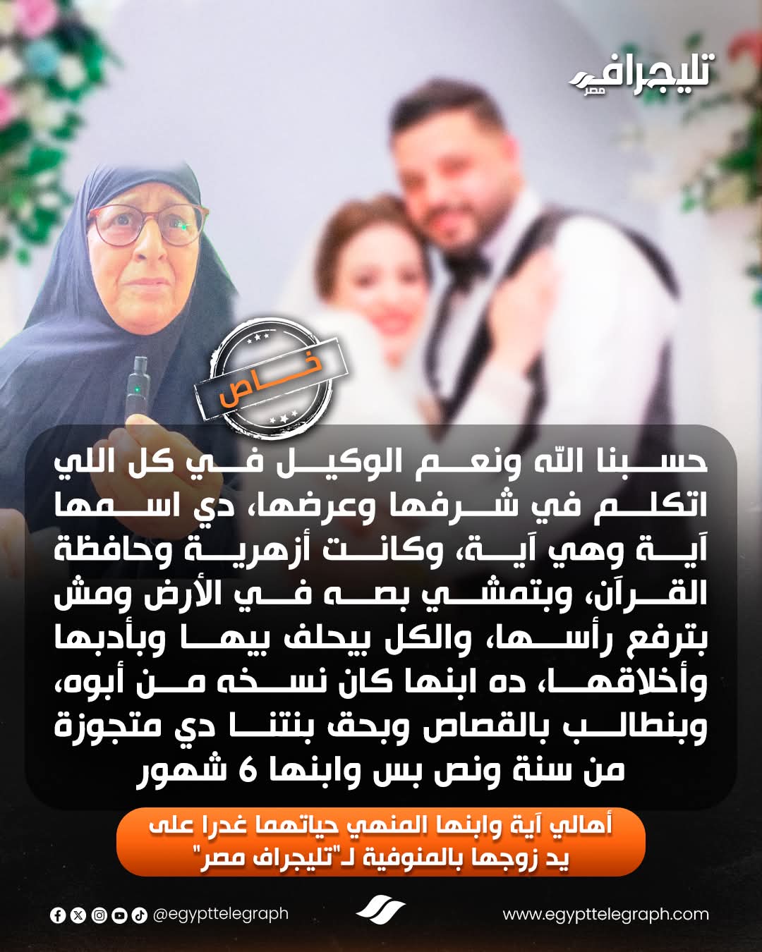 لم تكن "آية" الشابة العشرينية التي أصبحت حديث الشارع في المنوفية، تتوقع أن تنتهي حياتها بتلك الطريقة المأساوية، بعدما أقدم زوجها على إنهاء حياتها وحياة طفلها في دقائق، ثم نشر صورتهما بعد أن قضى عليهما عبر حسابه الشخصي.