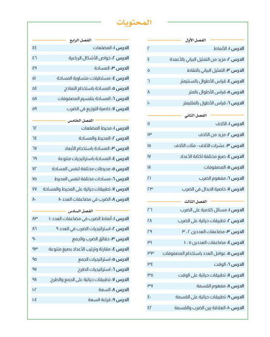 يتضمن منهج الرياضيات للصف الثالث الابتدائي 6 فصول تهدف إلى تطوير مهارات الطالب الحسابية والتفكيرية بطريقة شيقة وتفاعلية، وتأتي كالتالي: