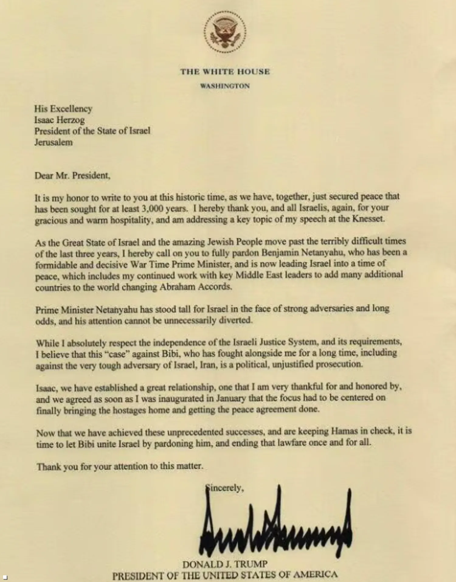 وجاء في الرسالة: "العفو عن نتنياهو سيكون خطوة مهمة لتوحيد إسرائيل بعد سنوات صعبة"، مؤكدًا أن نتنياهو "دافع بثبات عن إسرائيل في مواجهة خصوم أقوياء، وأن القضية المرفوعة ضده سياسية وغير مبررة".