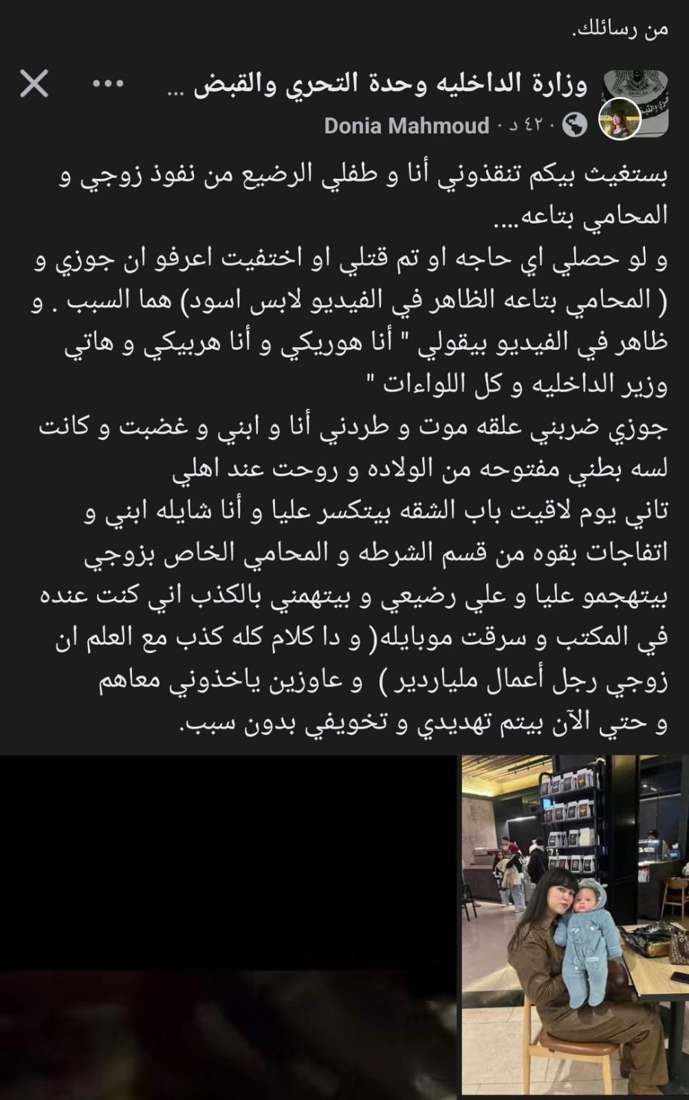واختتمت دنيا منشورها بكلمات مؤثرة قائلة، "بستغيث بيكم تنقذوني أنا وطفلي الرضيع من نفوذ زوجي، لو حصلي أي حاجة أو تم قتلي أو اختفيت اعرفوا إن زوجي هو السبب".