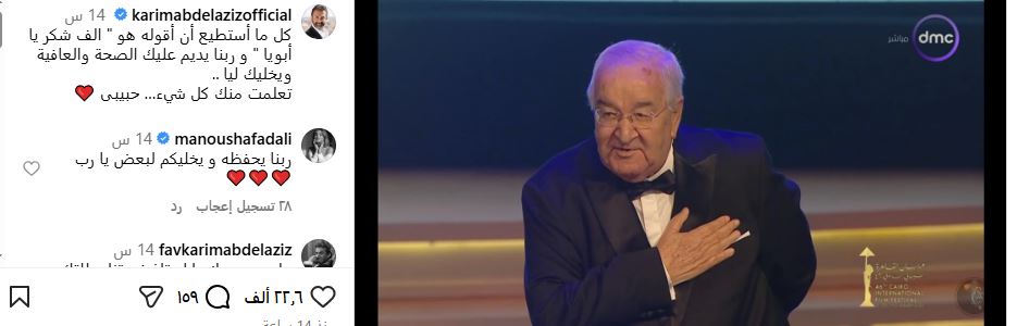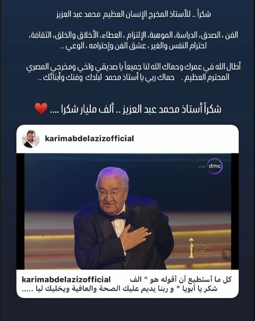 وفي سياق متصل، وجّه الفنان كريم عبد العزيز رسالة شكر وامتنان لوالده، المخرج محمد عبد العزيز، عبر حسابه الرسمي بموقع “إنستجرام”، قائلاً: "كل ما أستطيع أن أقوله هو ألف شكر يا أبويا، وربنا يديم عليك الصحة والعافية ويخليك ليا، تعلمت منك كل شيء، حبيبي".