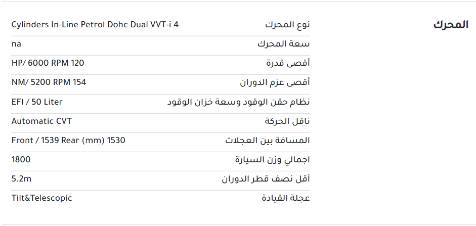 توفر تويوتا كورولا 2026 تجربة قيادة قوية وفعالة بفضل نظام التعليق المحسن وقدرتها على التحكمً الديناميكي بفضل محرك رباعي الأسطوانات VV-I Engine بقوة قصوى تبلغ 120 حصان/ 6000 دورة في الدقيقة وعزم أقصى 154 نيوتن متر/ 5200 دورة في الدقيقة.