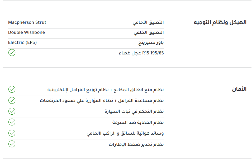 التعليق الخلفي المستقل يمنح قائد السيارة قدرة تحكم مطلقة، فضلًا عن التنقل بسلاسة على الطريق. وتجمع السيارة السيدان بين حداثة التصميم والتكنولوجيا الذكية، بالإضافة إلى معيار مبتكر لخصائص الأمان بما في ذلك 6 وسائد هوائية، وتوزيع إلكتروني للمكابح، والتحكم في ثبات السيارة ومانع الحركة ضد السرقة مما يجعلها الاختيار الأمثل في فئتها.