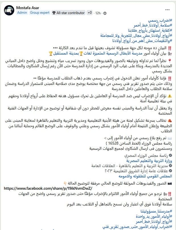 أوضح أولياء الأمور في بيانهم الموجه للمسؤولين أن إضرابهم وعدم ذهاب أولادهم للمدرسة مؤقت وليس ضد المدرسة أو العاملين، بل تحرك هدفه الحفاظ على أرواح الأولاد وحقهم في بيئة تعليمية آمنة.