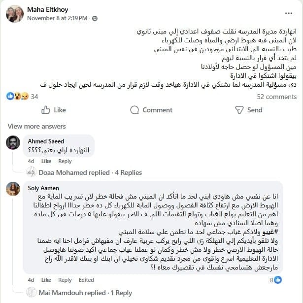 هذا المبنى الجديد الذي تم بناء على طلب أولياء الأمور، تم إنشائه من قِبل مقاول معرفة من جهتهم، حسب روايتهم، وبعد حدوث الخلل وشكاواهم، كان رد الإدارة: “لو مش عايز تودي ابنك براحتك”.