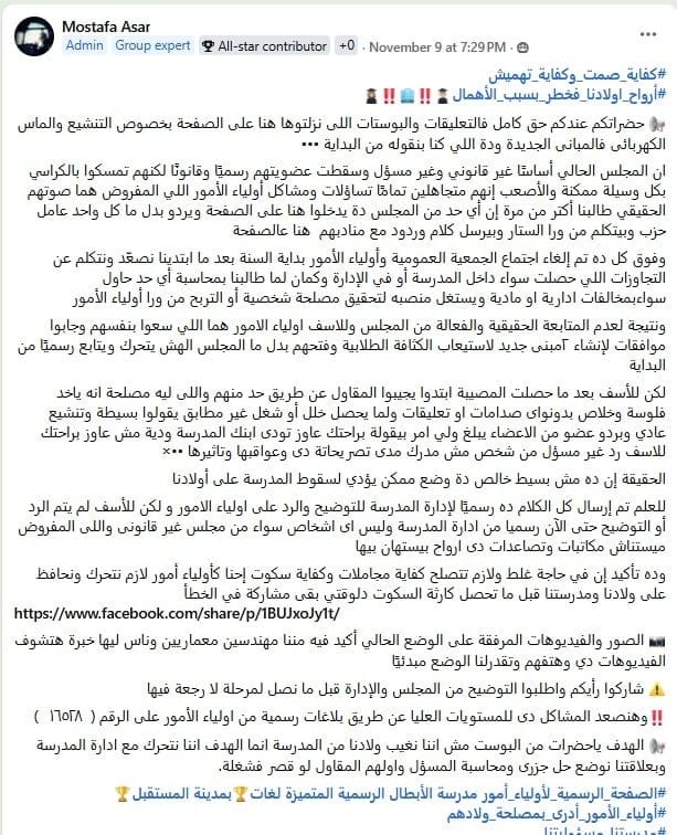 وتطرق أولياء الأمور إلى الحديث عن عدم قانونية المجلس الحالي، إذ سقطت عضويتهم رسميًا، ولكنهم تمسكوا بالمنصب، غير مكترثين بمشاكل أولياء الأمور.
