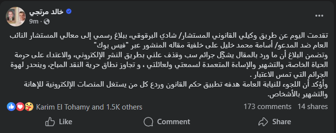وكتب خالد مرتجي، عبر حسابه على فيسبوك: "تقدمت اليوم عن طريق وكيلي القانوني، شادي البرقوقي، ببلاغ رسمي إلى النائب العام ضد المدعو، أسامة محمد خليل على خلفية مقاله المنشور عبر "فيسبوك".