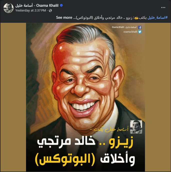 وكان أسامة خليل، قد نشر منشورًا عبر صفحته على فيسبوك، موجهًا لخالد مرتجي، بعنوان: “زيزو.. خالد مرتجي وأخلاق (البوتوكس)”، اتهم فيه مرتجي بأنه من “الذين أفسدت الحياة وجوههم، وأطارت الشهرة والنجومية عقولهم، فبات يقول ما لا يفعل، ويفعل ما لا يقول”.