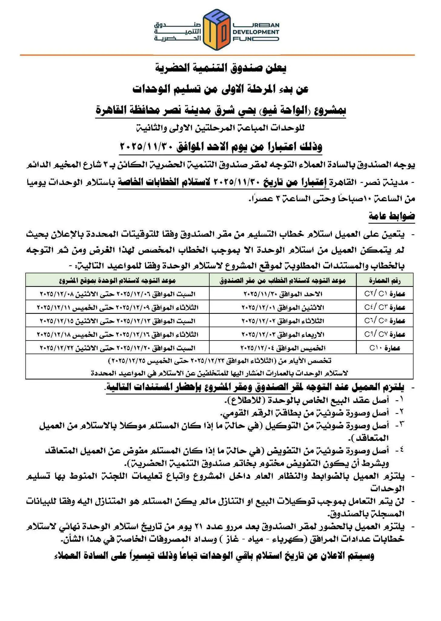وأشار رئيس الصندوق، إلى أن استلام الوحدات المباعة للمرحلتين الأولى والثانية سيبدأ اعتبارًا من يوم الأحد الموافق 30 نوفمبر 2025، على أن تُخصص الفترة من 23 إلى 25 ديسمبر 2025 للمتخلفين عن المواعيد المحددة.