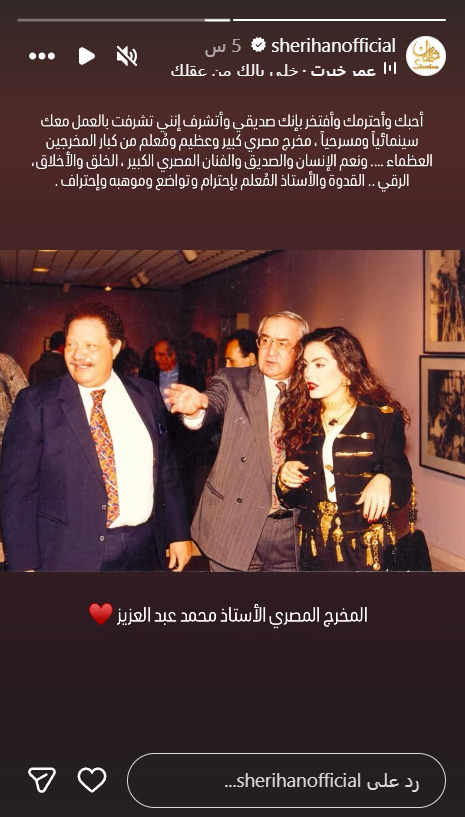 ونشرت شريهان صورة لها مع محمد عبدالعزيز، ويحيى الفخراني، عبر حسابها الرسمي على منصة “إنستجرام” وعلقت عليها بالقول: “أحبك واحترمك وأفتخر بأنك صديقي وأتشرف أنني تشرفت بالعمل معك سينمائيًا ومسرحيًا”.