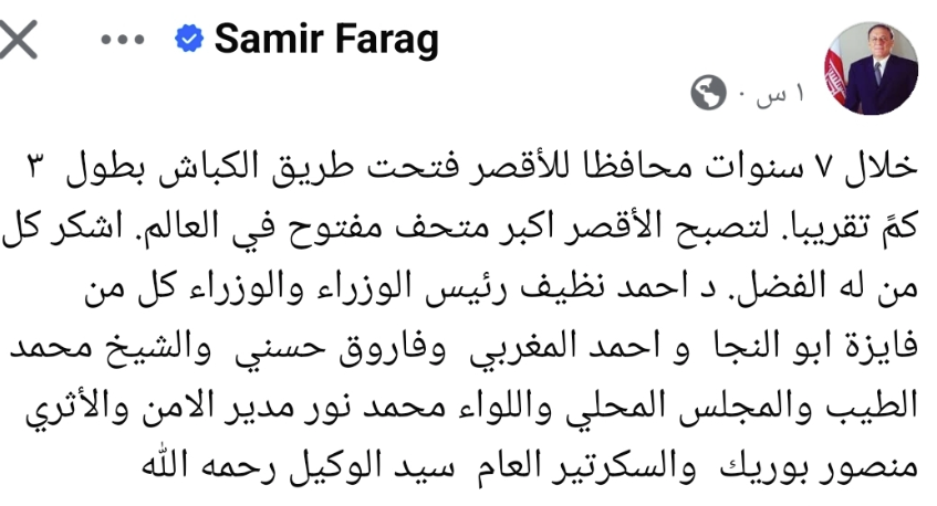 ووجّه الدكتور سمير فرج رسالة شكر ووفاء لكل من ساهم في إنجاز هذا المشروع الوطني العملاق، قائلاً: "أشكر كل من كان له الفضل في تحويل الحلم إلى حقيقة، وعلى رأسهم الدكتور أحمد نظيف، رئيس الوزراء الأسبق، والوزراء فايزة أبو النجا، وأحمد المغربي، وفاروق حسني، والشيخ محمد الطيب، والمجلس المحلي، واللواء محمد نور مدير الأمن، والأثري منصور بوريك، والسكرتير العام الراحل سيد الوكيل، رحم الله الجميع ممن رحلوا، وبارك في من ما زالوا يواصلون العطاء."