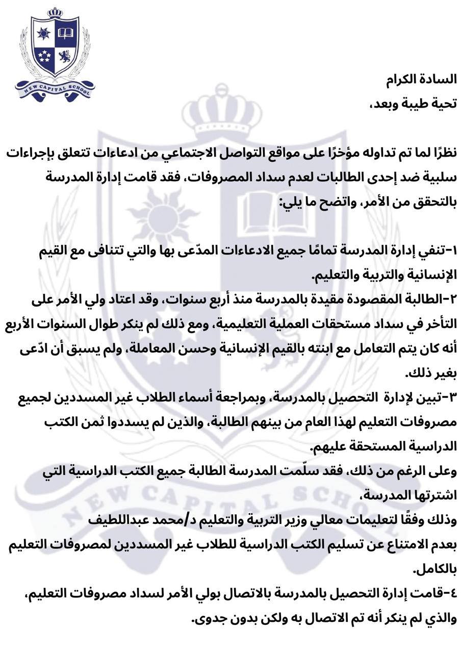 وقالت مدرسة نيو كابيتال، في بيانها، إنه نظرا لما تم تداوله مؤخرا على مواقع التواصل الاجتماعي من ادّعاءات تتعلق بإجراءات سلبية ضد إحدى الطالبات لعدم سداد المصروفات، فقد قامت إدارة المدرسة بالتحقيق من الأمر، واتضح ما يلي: