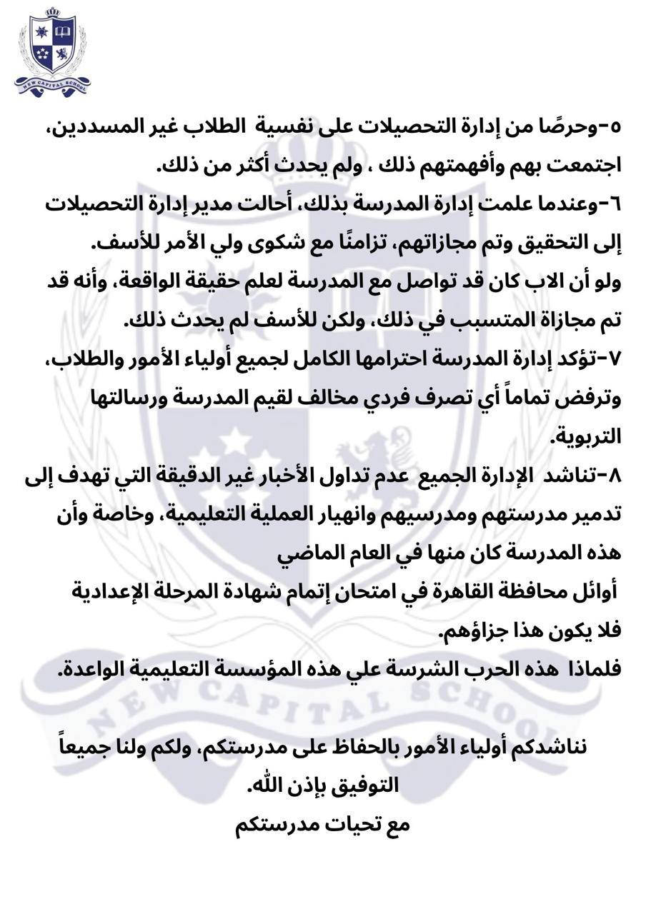 وناشدت إدارة مدرسة نيو كابيتال الجميع عدم تداول الأخبار غير الدقيقة التي تهدف إلى تدمير مدرستهم ومدرسيهم وانهيار العملية التعليمية، وخاصة وأن هذه المدرسة كان منها في العام الماضي أوائل محافظة القاهرة في امتحان إتمام شهادة المرحلة الإعدادية فلا يكون هذا جزاؤهم