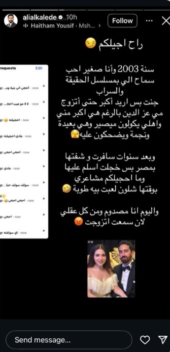 وأوضح الإعلامي علي الخالدي، عبر "ستوري" نشره على حسابه الشخصي بمنصة “إنستجرام”، أنه كان يحلم بزواج الفنانة مي عز الدين وهو بسن المراهقة، وبدأ ذلك الحلم أن يملأ قلبه عند مشاهدته لمسلسل الحقيقة والسراب الذي عرض بعام 2003.
