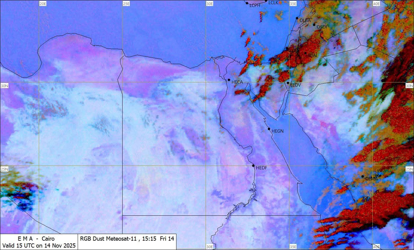 وأشارت الهيئة العامة للأرصاد الجوية، إلى وجود فرص أمطار متوسطة ورعدية أحيانًا على مناطق من (مطروح - العلمين - المنوفية - الشرقية - الإسماعيلية - السويس)، حيث فرص أمطار خفيفة قد تكون متوسطة ورعدية أحيانا على مناطق من (القاهرة الكبرى - شمال الصعيد - خليج السويس - وسط وجنوب سيناء) وجنوباً على مدينتي حلايب وشلاتين.