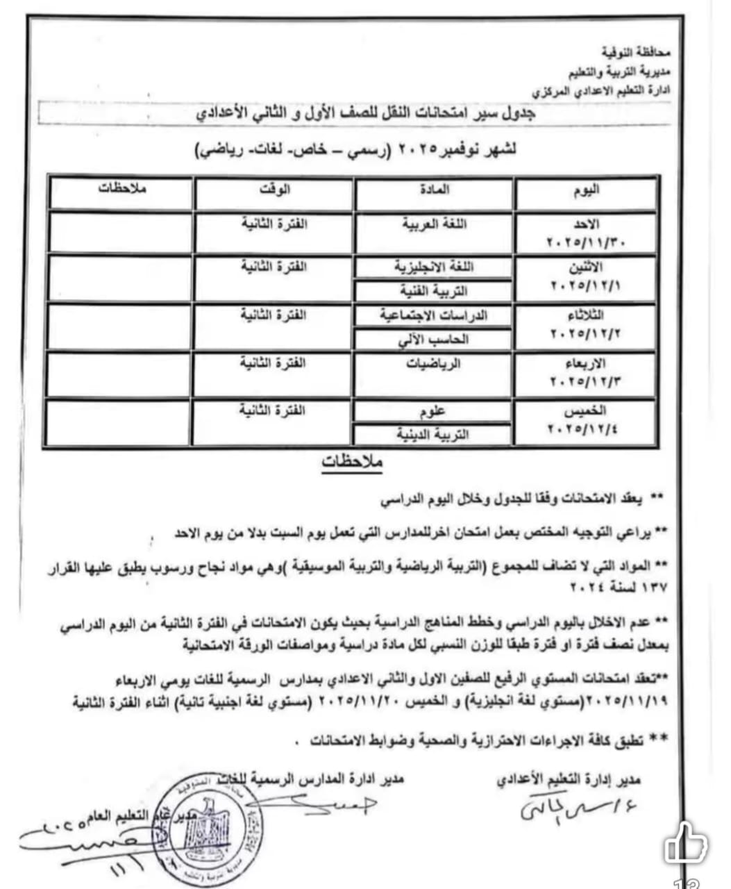 جدول امتحانات شهر نوفمبر للمرحلة الإعدادية محافظة المنوفية