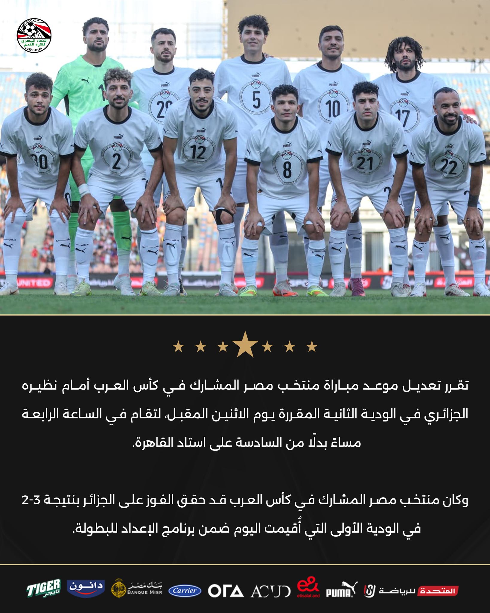 وكان منتخب مصر المشارك في كأس العرب قد فاز في الودية الأولى على الجزائر بنتيجة 3–2، في اللقاء الذي أُقيم اليوم ضمن برنامج الإعداد للبطولة.