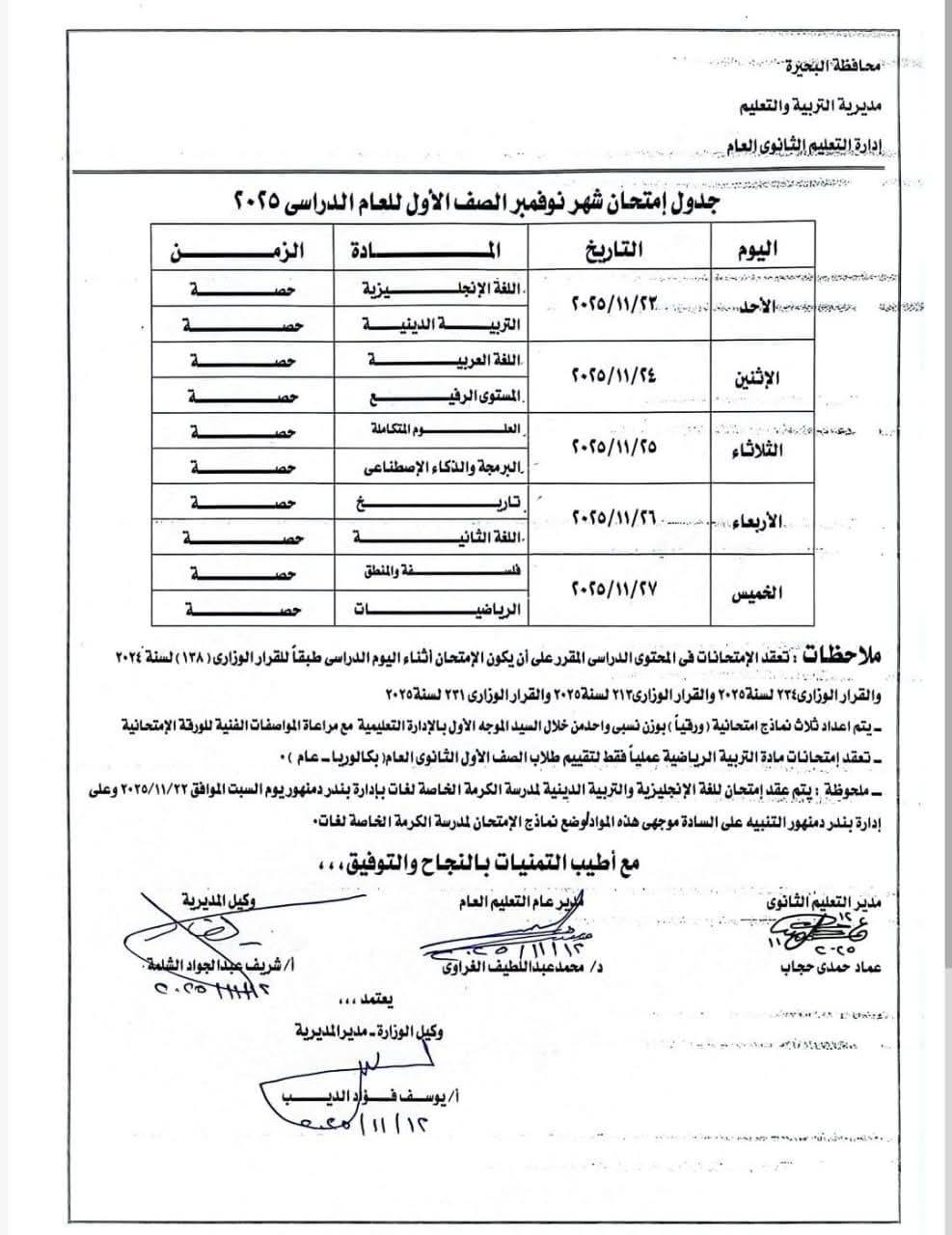 جدول امتحانات شهر نوفمبر 2025 بالبحيرة للصف الأول الثانوي