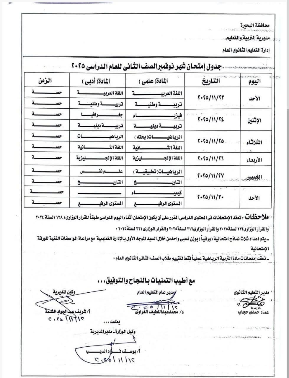 جدول امتحانات شهر نوفمبر 2025 بالبحيرة للصف الثاني الثانوي