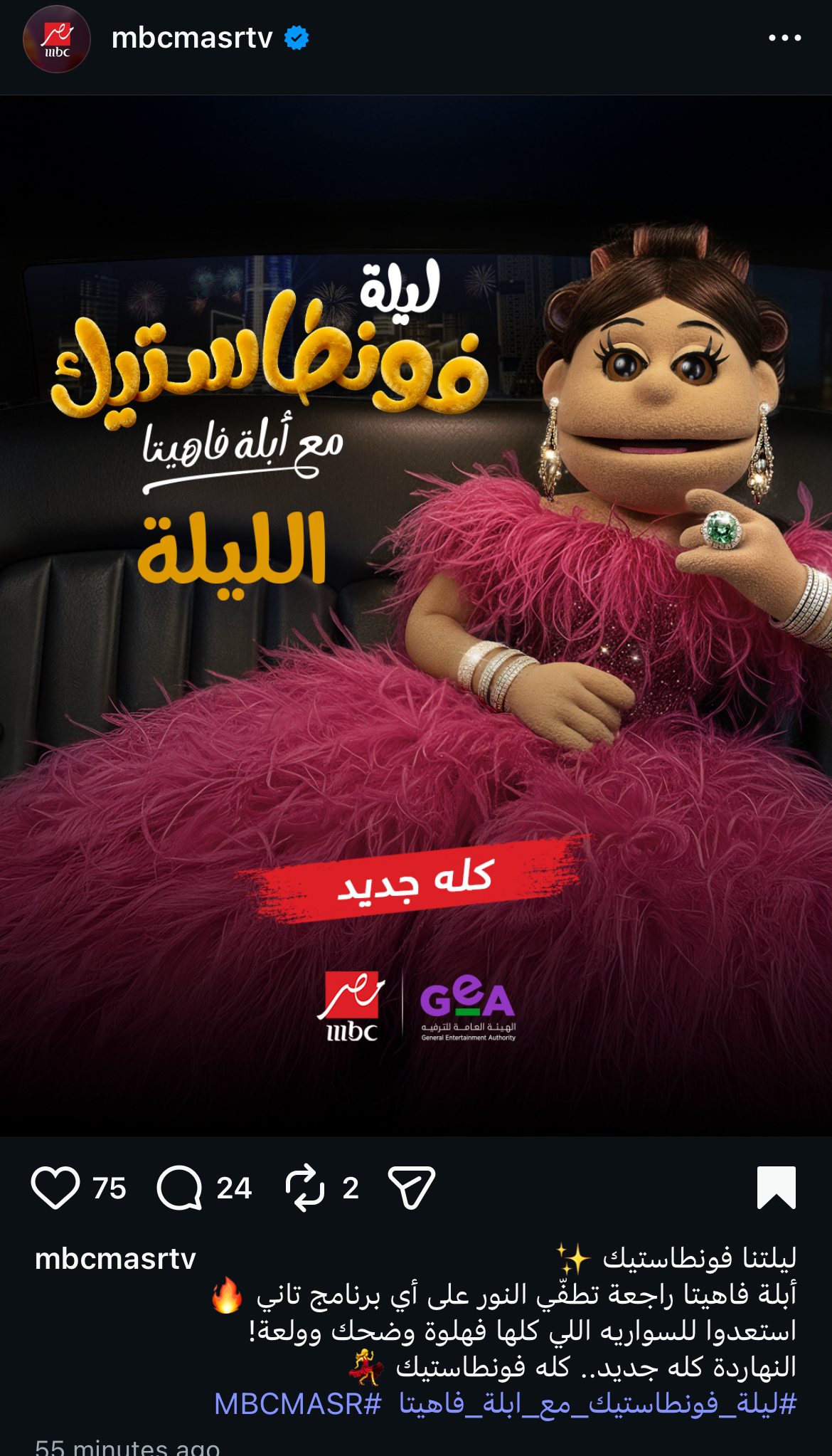 وعلقت على الملصق: "ليلتنا فونطاستيك، أبلة فاهيتا راجعة تطفّي النور على أي برنامج تاني استعدوا للسواريه اللي كلها فهلوة وضحك وولعة! النهاردة كله جديد.. كله فونطاستيك".