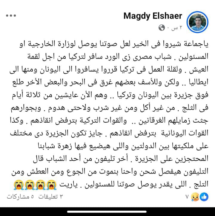 أثارت واقعة 3 مواطنين مصريين عالقين في جزيرة بين تركيا واليونان اهتمام مستخدمي مواقع التواصل الاجتماعي، خلال الساعات الماضية، بعد استغاثتهم بأحد الأصدقاء في مصر، والذي كتب منشورًا عبر صفحته الرسمية على “فيسبوك”، من أجل إنقاذهم.