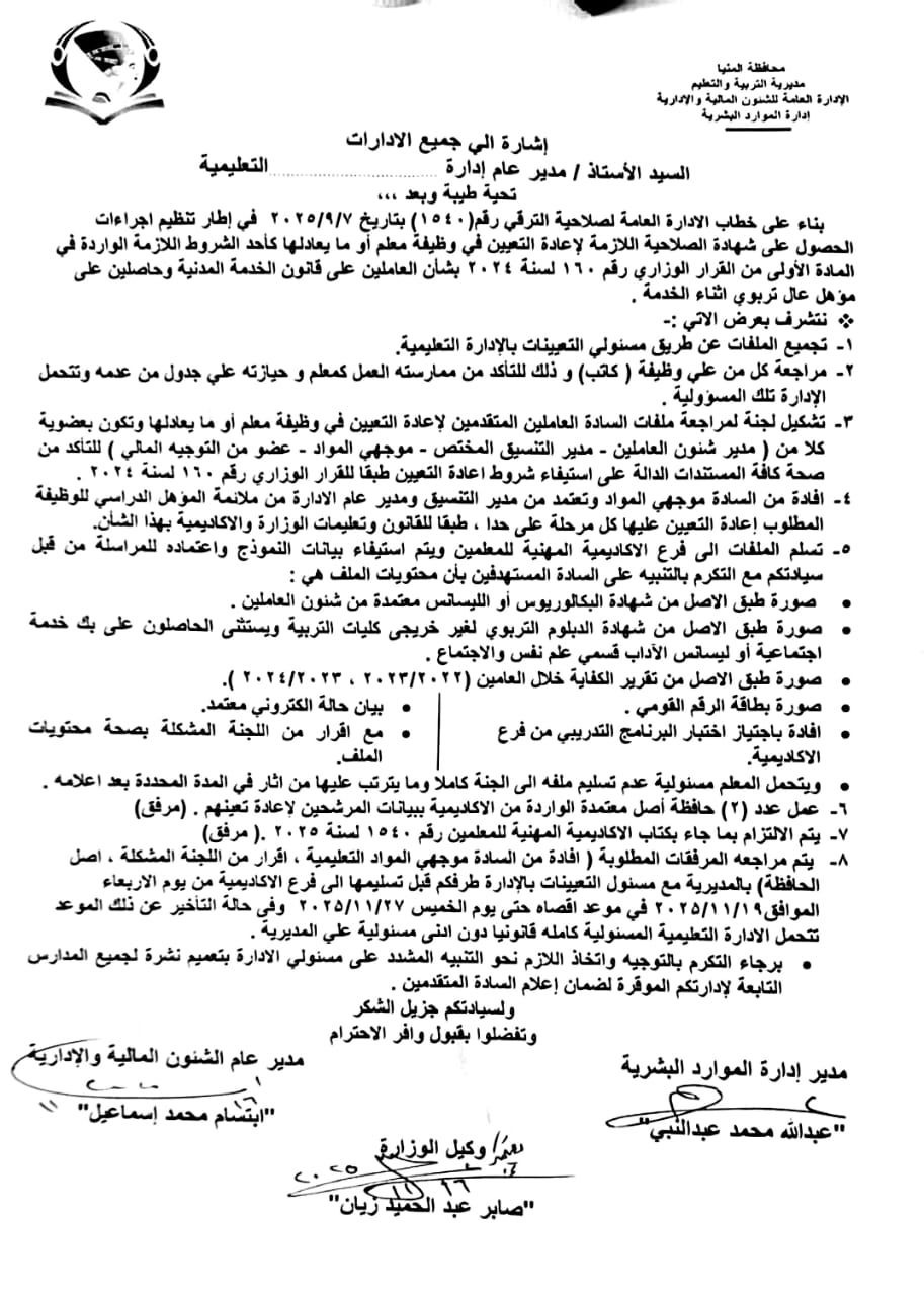 - تشكيل لجنة لمراجعة ملفات العاملين المتقدمين لإعادة التعيين في وظيفة معلم أو ما يعادلها وتكون بعضوية كلا من (مدير شئون العاملين، مدير التنسيق المختص، موجهي المواد، عضو من التوجيه المالي) للتأكد من صحة كافة المستندات الدالة على استيفاء شروط إعادة التعيين طبقا للقرار الوزاري رقم 160.