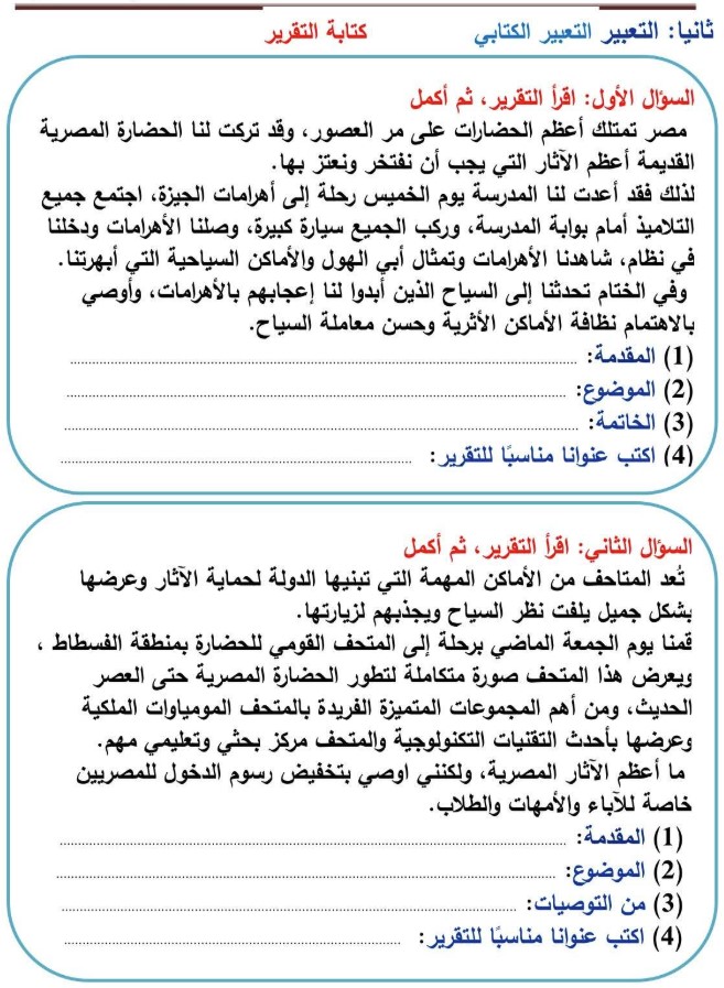 - تدريبات تعبير كتابي تعتمد على مهارات الكتابة السليمة.