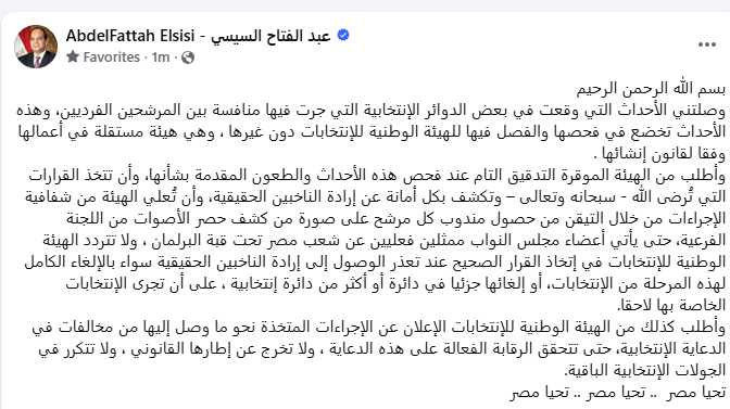 وأشار الرئيس السيسي في منشور له عبر صفحته على “فيسبوك”، إلى أن هذه الأحداث تخضع في فحصها والفصل فيها للهيئة الوطنية للانتخابات دون غيرها، وهي هيئة مستقلة في أعمالها وفقا لقانون إنشائها.