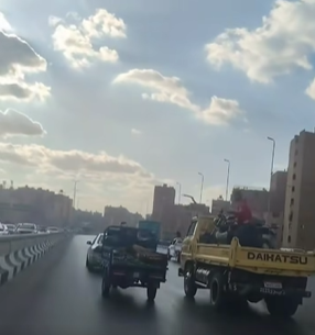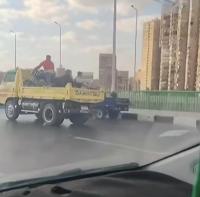تداول مستخدمو مواقع التواصل الاجتماعي، مطقع فيديو يظهر خلاله مطاردة بين تروسيكل وسيارات نقل أعلى الطريق الدائري.