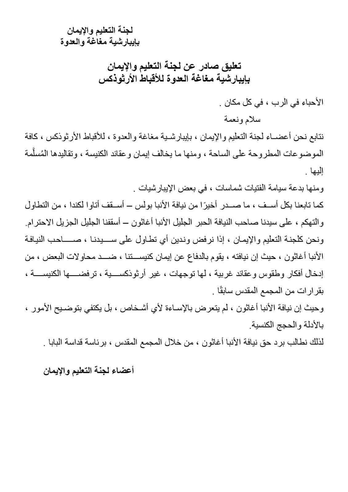 وتابع: "نحن كلجنة التعليم والإيمان، نرفض وندين أي تطاول على الأنبا أغاثون، حيث إن نيافته يقوم بالدفاع عن إيمان كنيستنا، ضد محاولات البعض إدخال أفكار وطقوس وعقائد غربية، لها توجهات غير أرثوذكسية ترفضها الكنيسة بقرارات سابقة من المجمع المقدس".