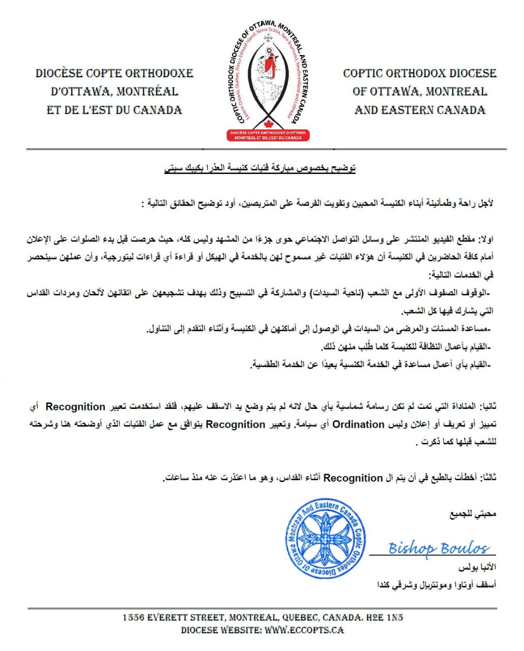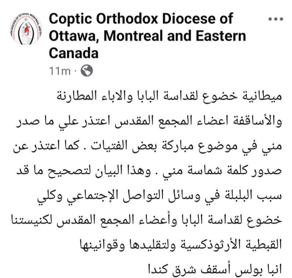 بيان جدد للأنبا بولس أسقف شرق كندا