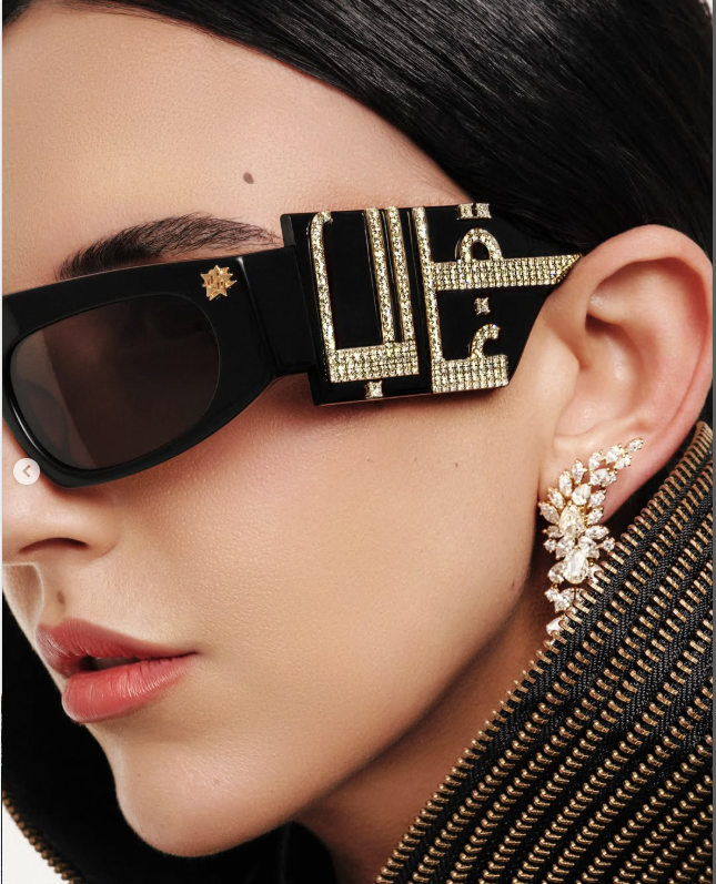 وأضافت: “صممت النظارات الفريدة لتكون قطعًا فنية قابلة للجمع وليس الاستهلاك، وذلك لاحتوائها على 355 ماسة من أجود أنواع الماسات، تجمع بين شكل الدائرة وشكل البرنسية ذو الزوايا الحادة لتتبع بدقة منحنيات ونقاط كلمة القالب غالب المكتوبة على النظارة".