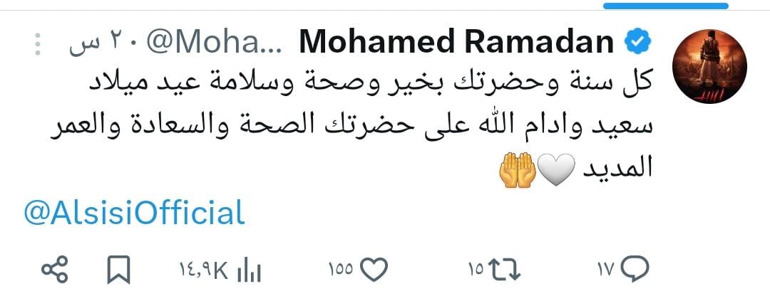 وكتب محمد رمضان عبر حسابه الرسمي على منصة “إكس”: "كل سنة وحضرتك بخير وصحة وسلامة عيد ميلاد سعيد وادام اللّٰه على حضرتك الصحة والسعادة والعمر المديد".