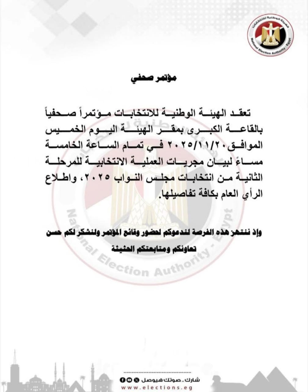 أعلنت الهيئة الوطنية للانتخابات إقامة مؤتمر صحفي لبيان مجريات العملية الانتخابية للمرحلة الثانية من انتخابات مجلس النواب 2025 وإطلاع الرأي العام بكل تفاصيلها.