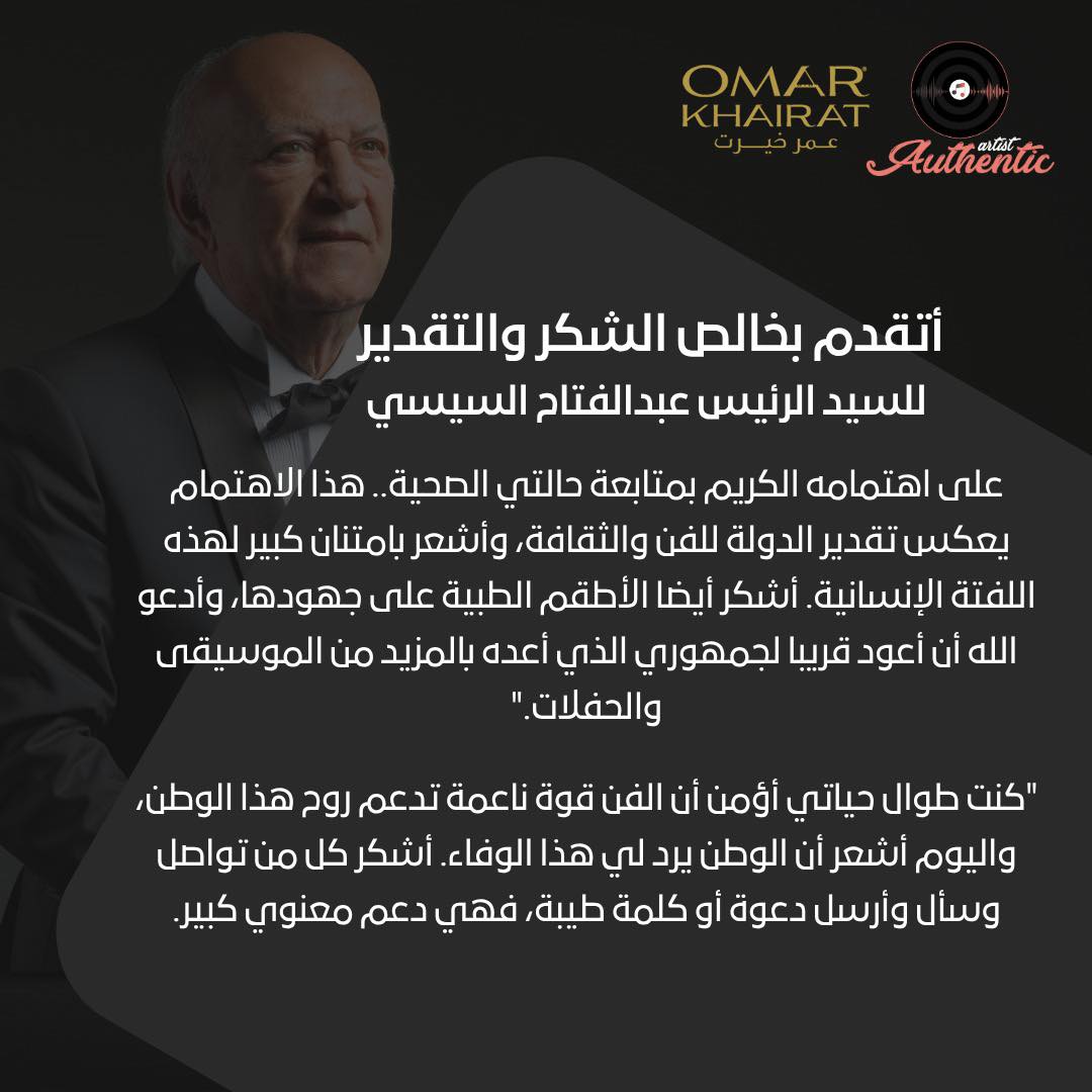 وكتبت الصفحة الرسمية لـ عمر خيرت بمنصة “فيسبوك”: “أتقدم بخالص الشكر والتقدير للسيد الرئيس عبدالفتاح السيسي على اهتمامه الكريم بمتابعة حالتي الصحية، هذا الاهتمام يعكس تقدير الدولة للفن والثقافة، وأشعر بامتنان كبير لهذه اللفتة الإنسانية، أشكر أيضا الأطقم الطبية على جهودها، وأدعو الله أن أعود قريبا لجمهوري الذي أعده بالمزيد من الموسيقى والحفلات”.