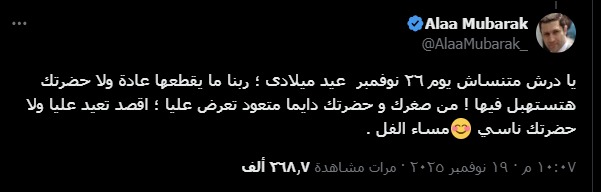 وكتب مبارك الابن في تدوينته: "يا درش متنساش يوم 26 نوفمبر عيد ميلادي، ربنا ما يقطعها عادة ولا حضرتك هتستهبل فيها.. من صغرك وحضرتك دايمًا متعود تعرض عليا؛ أقصد تعيّد عليا ولا حضرتك ناسي".