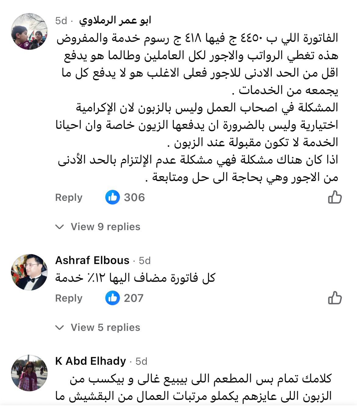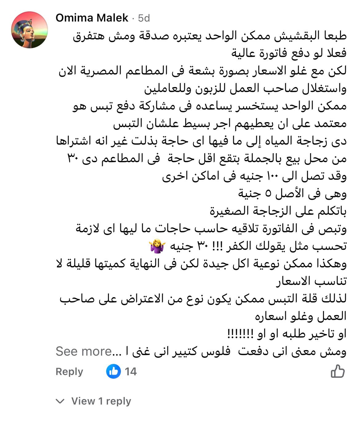 وأكد “طارق الجيار”، “العيب كله على المطعم، مش على الزبون”، وأكدت “منال خليفة”، “بدل ما نصلح الغلط من جيب المواطن، نصلح النظام نفسه، يعني إيه عامل مطعم راق يقبض 4000 جنيه؟ ده سحت”.