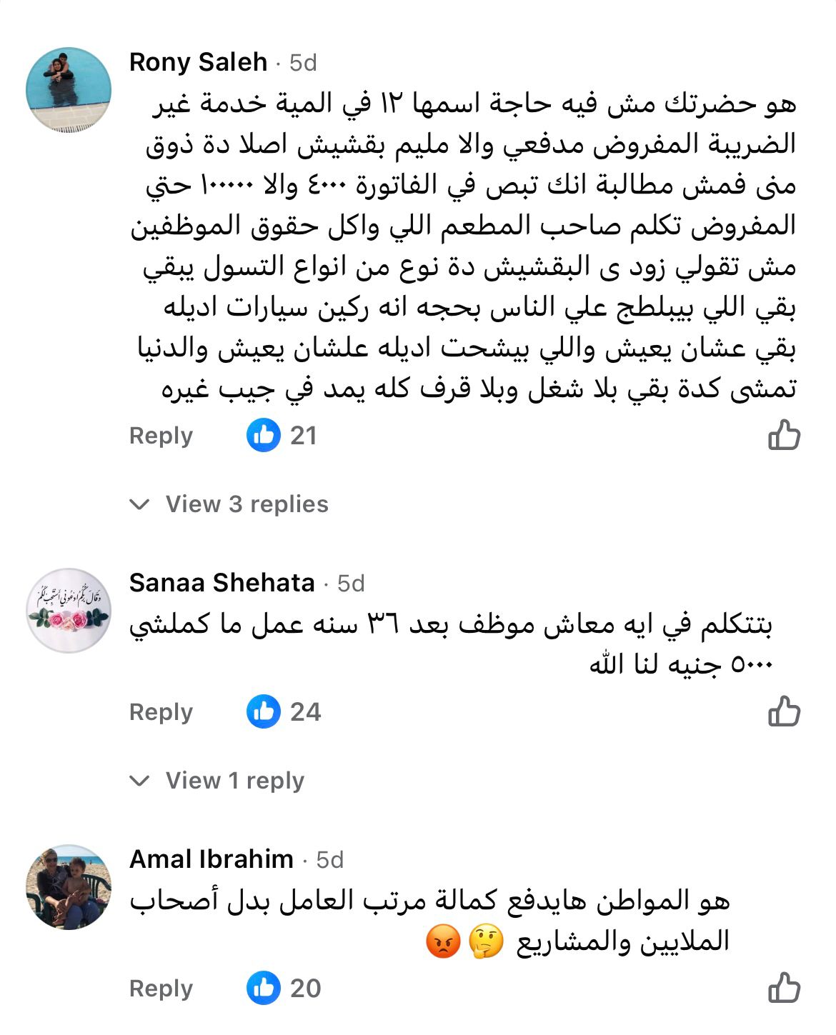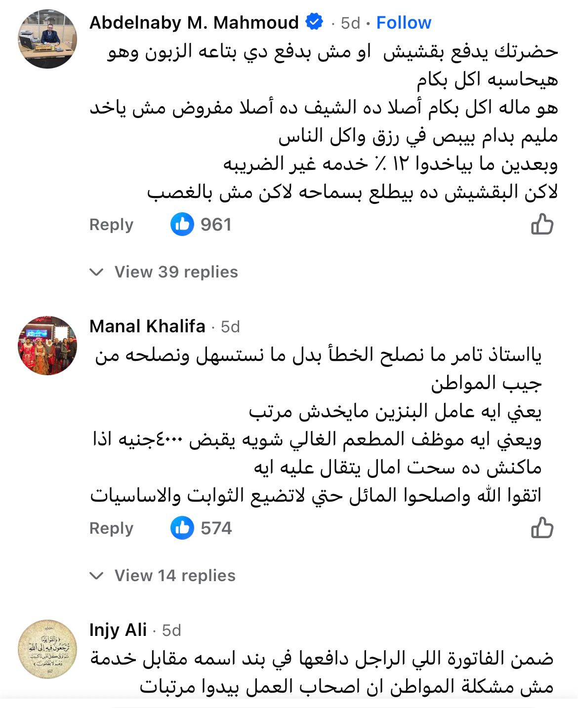 وقال “حمدي فؤاد”، “الأولى توجه كلامك لصاحب المطعم، ليه يشغل الناس بمرتبات هزيلة ويسيبهم يستنوا بقشيش؟، فيما قالت ”حنين مصطفى"، “ثقافة البقشيش لازم تلغى، العامل ليه حق في أجر محترم، المبدأ الأساسي: اعط الأجير حقه قبل أن يجفّ عرقه”.
