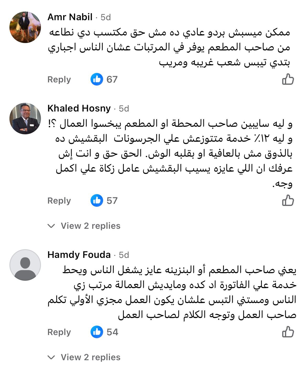 علق “عبد النبي محمود”، أحد رواد مواقع التواصل الاجتماعي، “البقشيش حاجة شخصية، اللي عايز يسيب يسيب، واللي مش عايز محدش يقدر يجبره، وبعدين مش المطاعم بتاخد 12% خدمة؟”.