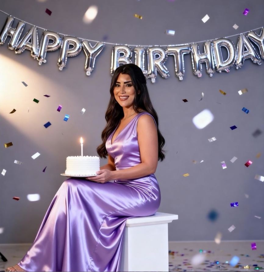 وجاءت إطلالة أيتن متناغمة مع ديكور الاحتفال الذي تزيّن ببالونات فضية تحمل عبارة “HAPPY BIRTHDAY”، ليكتمل المشهد بجمال وبساطة تعكس روحها المرحة وحضورها اللافت.