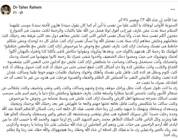 وقال شقيق محمد رحيم في رسالته المؤلمة: “غدًا الأحد إن شاء الله 23 نوفمبر 2025، السنوية الأولى لوفاتك يا أغلى عليّ من نفسي… سنة عدّت وأنا لا أملك إلا أن أقول: لولا فضل الله عليّ بالثبات لخرجت إلى الشوارع أكلم نفسي من هول الفقد، سنة وأنا أتساءل: كيف كنت تعيش بين هؤلاء بعدما عرفت حقيقتهم بعد رحيلك؟ كيف تحملت كل هذا وحدك وصامت لا تنطق؟ كيف استطعت أن تتعامل مع من لا يرحمون؟”.