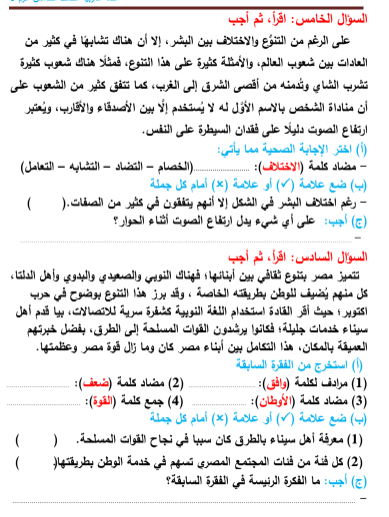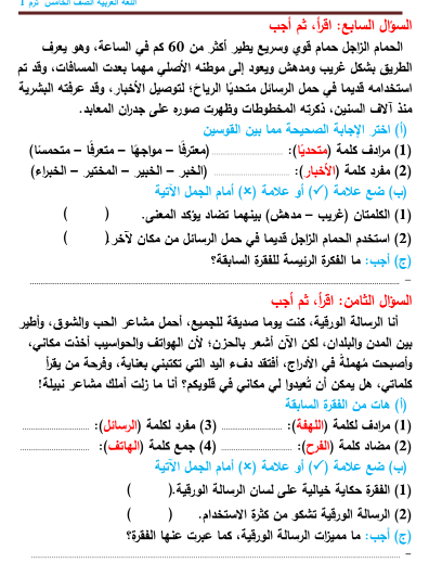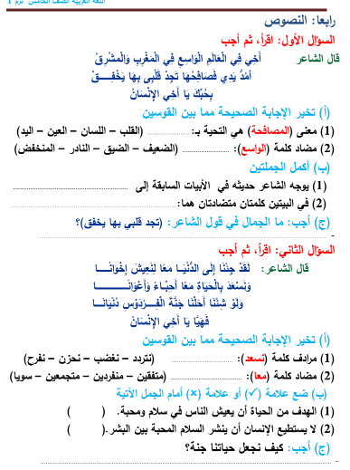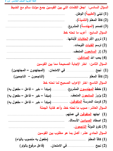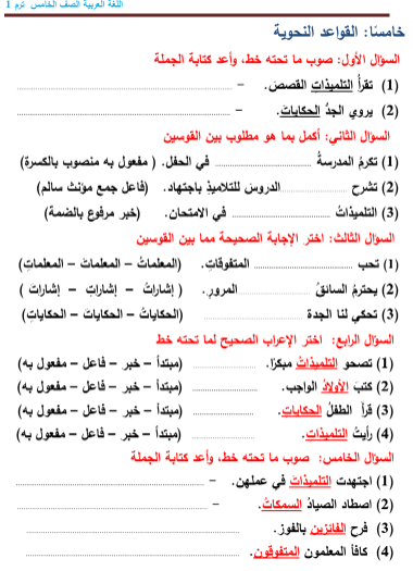 امتحان شهر نوفمبر للصف الخامس الابتدائي لغة عربية