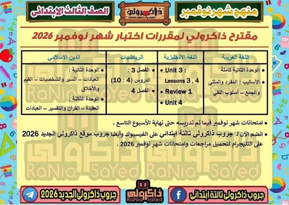 ويمكن الاطلاع على مقرر امتحان شهر نوفمبر 2025 للصف الخامس الابتدائي من خلال الصورة التالية: