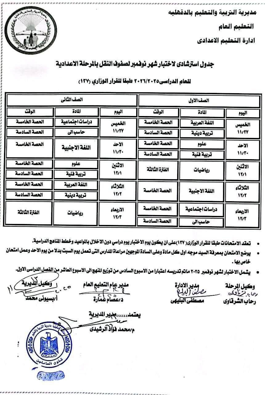 جدول امتحانات شهر نوفمبر 2025 للمرحلة الإعدادية محافظة الدقهلية